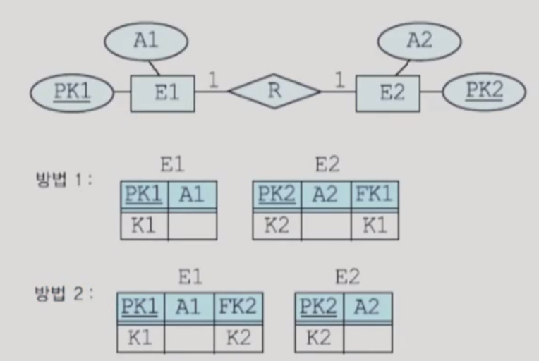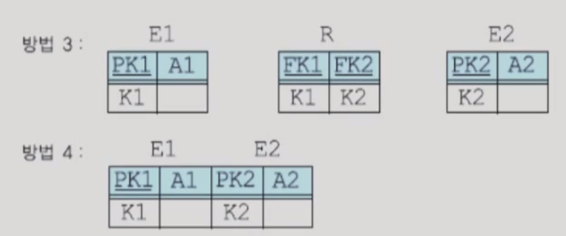 - 방법 4는 릴레이션 E1과 E2는 각각 독립적인 의미를 갖는 엔티티인데, 이를 묶어놓으면 혼선이 올 수 있다. BUT, 퍼포먼스 면으로는 성능이 좋음.