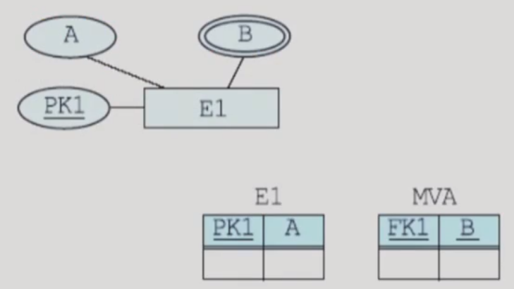 - 다치 애트리뷰트에 해당하는 애트리뷰트를 릴레이션 R에 포함시키고, 다치 애트리뷰트를 애트리뷰트로 갖는 엔티티 타입이나 관계 타입에 해당하는 릴레이션의 기본 키를 릴레이션 R의 외래 키로 포함시킴