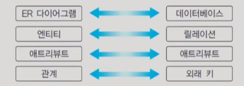- ER 스키마에는 엔티티 타입과 관계 타입이 존재하지만, 관계 데이터베이스에는 엔티티 타입과 관계 타입을 구분하지 않고, relation들만 있음