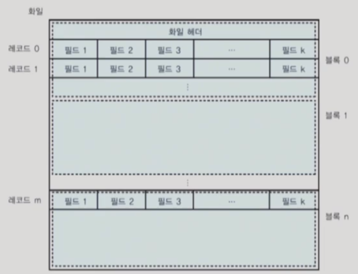 - 한 릴레이션을 구성하는 레코드들의 모임이 파일이라고 부르는 블록들의 모임에 저장됨