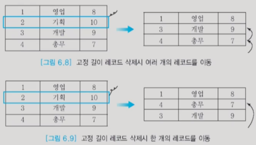 - 삭제: 원하는 레코드를 찾은 후에 그 레코드를 삭제하고, 삭제된 레코드가 차지하던 공간을 재사용하지 않음