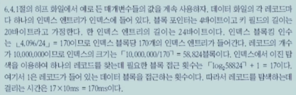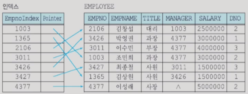 - EMPLOYEE 파일이 EMPNO의 순서대로 저장되어 있을 때 첫 번째 SELECT문은 이진 탐색을 이용할 수 있고, 두 번째 SELECT문의 WHERE절에 사용된 SALARY는 저장 순서와 무관하기 때문에 파일 전체를 탐색해야 함 (이진탐색의 시간 복잡도 -> log_2_n