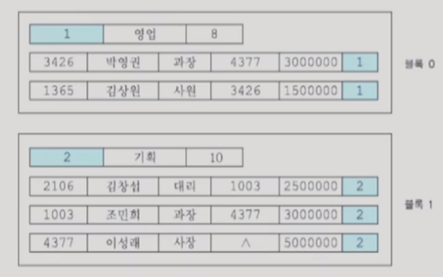- 연관된 필드들이 모여서 고정 길이 또는 가변 길이의 레코드가 됨