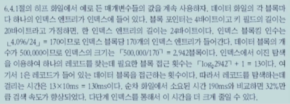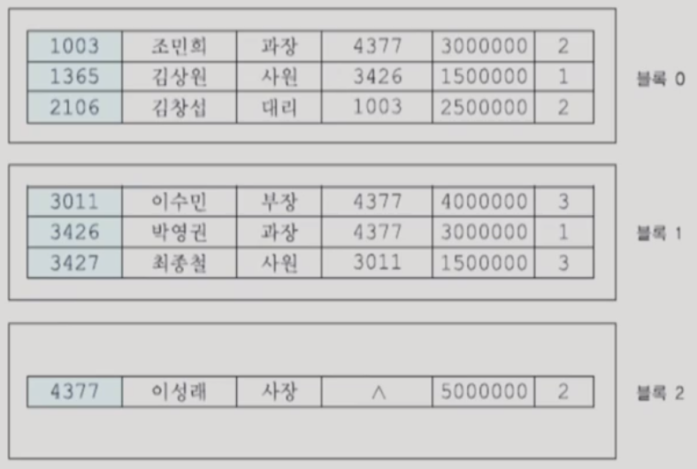 - 히프 파일에 b개의 블록이 있다고 가정할 때, 원하는 블록을 찾기 위해서 평균적으로 b/2개의 블록을 읽어야 한다. (select title from employee where empno = 1365;)