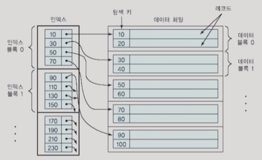 - 한 파일은 한 개의 희소 인덱스와 다수의 밀집 인덱스를 가질 수 있음