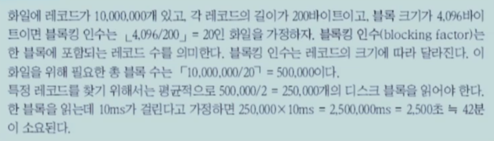 - 디스크에서 임의의 블록을 읽어오거나 기록하는데 걸리는 시간은 탐구 시간(seek time), 회전 지연 시간(rotational delay), 전송 시간(transfer time)의 합 → 전송 시간 : 찾은 걸 메모리로 올리는데 걸리는 시간 // seek time은 variation이 큰 편임.