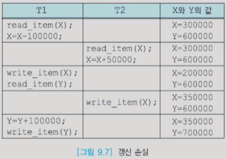 - 갱신 손실(lost update) : 수행 중인 트랜잭션이 갱신한 내용을 다른 트랜잭션이 덮어씀으로써 갱신이 무효가 되는 것