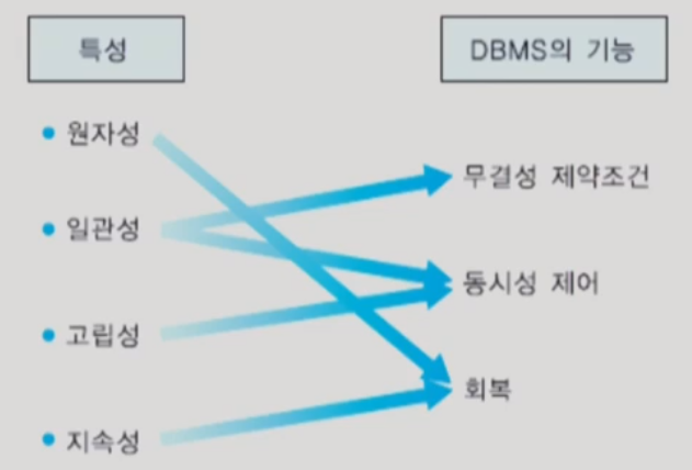 - 회복(recovery) : 데이터베이스를 갱신하는 도중에 시스템이 고장나도 데이터베이스의 일관성을 유지함