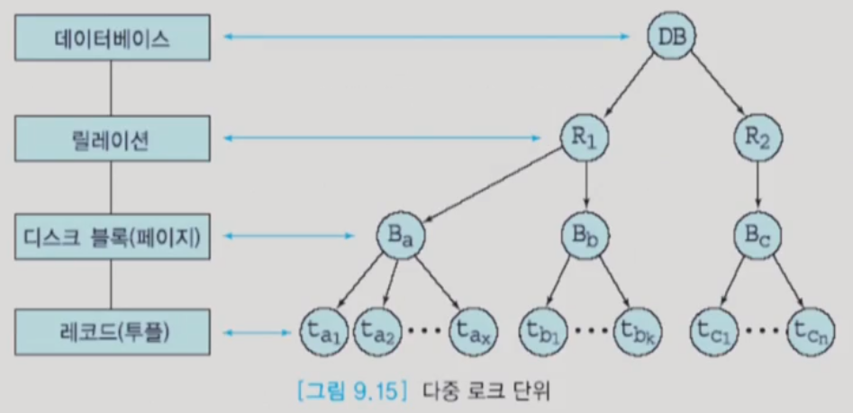 - 데이터베이스에서 로크할 수 있는 단위로는 데이터베이스, 릴레이션, 디스크 블록, 투플 등