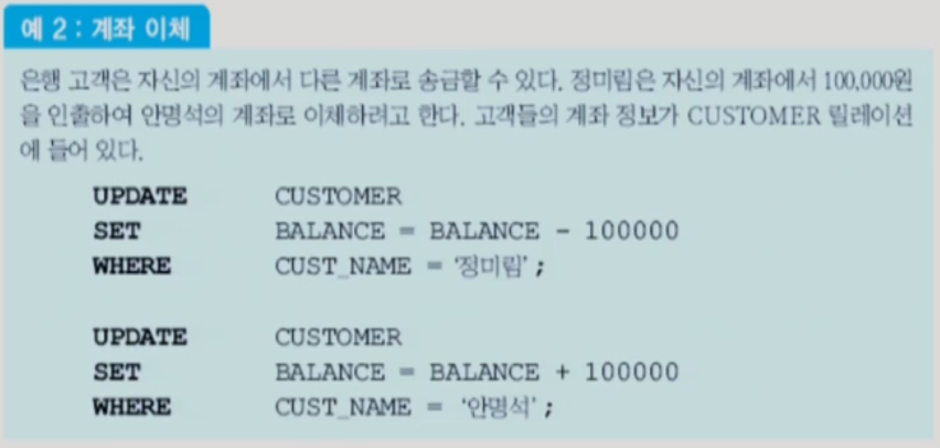 - 위의 두 개의 UPDATE문은 둘 다 완전하게 수행되거나 한 UPDATE문도 수행되어서는 안되도록, 즉 하나의 트랜잭션(단위)처럼 DBMS가 보장해야 함.
