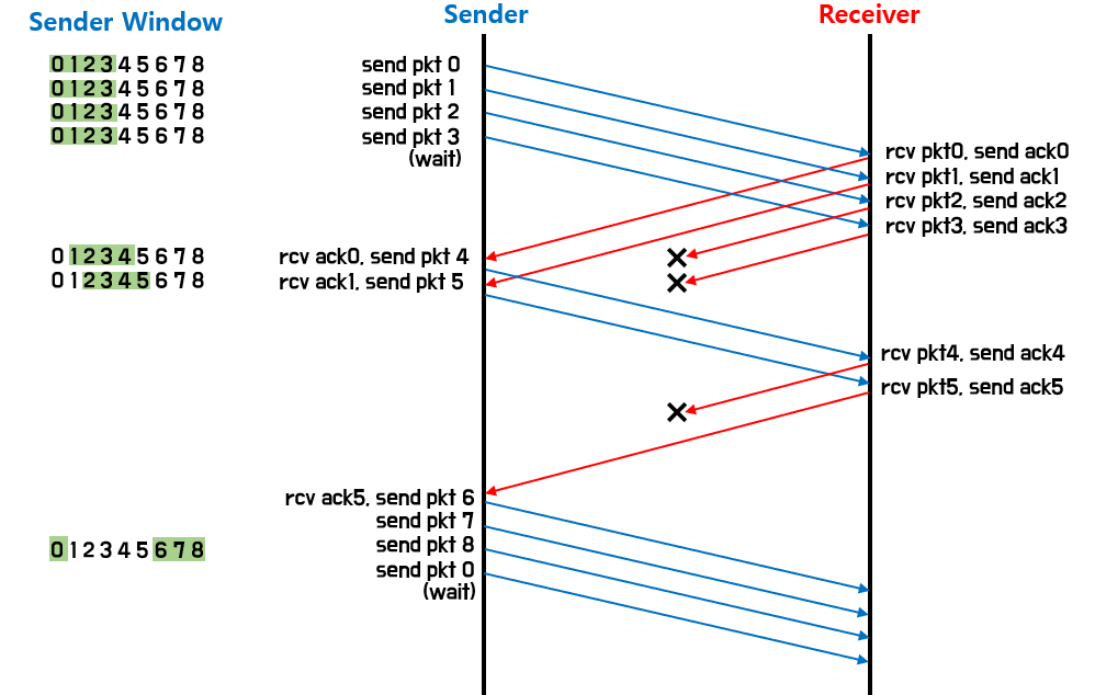 Go-Back-N 방식은 receiver 측에서 순서대로 받지 못한 패킷이 있다면 해당 패킷부터 다시 재전송 하는 방식이다.