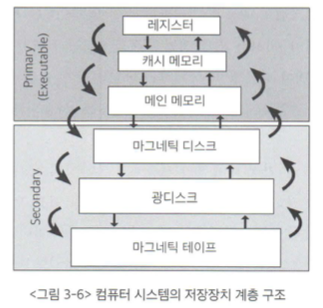 - 컴퓨터 시스템을 구성하는 저장 장치는 빠른 저장장치부터 느린 저장장치까지 계층 구조로 이루어져 있으며, 빠른 저장장치는 단위 공간 당 가격이 높아 적은 용량을 사용하고 느린 저장장치는 가격이 저렴해 대용량을 사용하는 반면 접근 속도가 느리다는 단점이 있다.