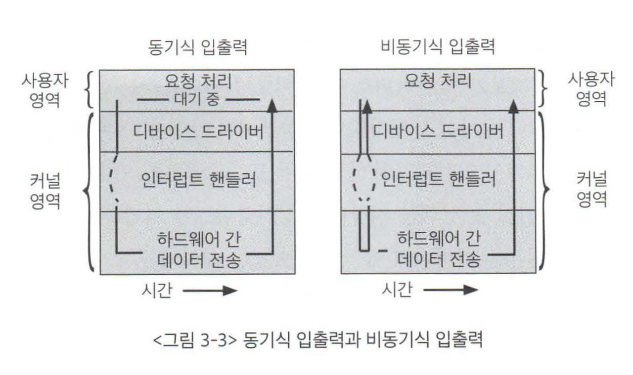 - 입출력 연산과 관련 없는 작업을 먼저 수행하게 된다. 또한 입출력 요청이 디스크에 쓰는 요청이라고 가정하면 더더욱 다음 명령과 상관이 없을 가능성이 높으므로 비동기식 입출력을 사용할 수 있다.