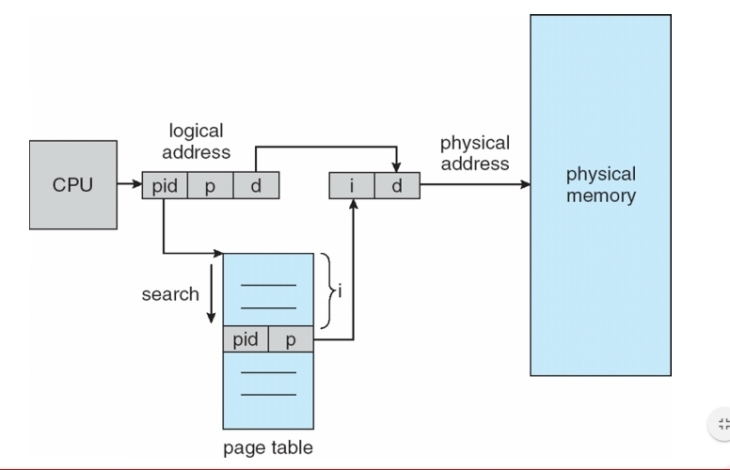 - 페이지 테이블의 항목은 어느 프로세스의 어느 페이지가 이 프레임에 저장되었는가의 정보를 보관하고, 이 정보는 프로세스 번호(pid)와 그 프로세스 내의 논리적 페이지 번호(p)를 담고 있다.