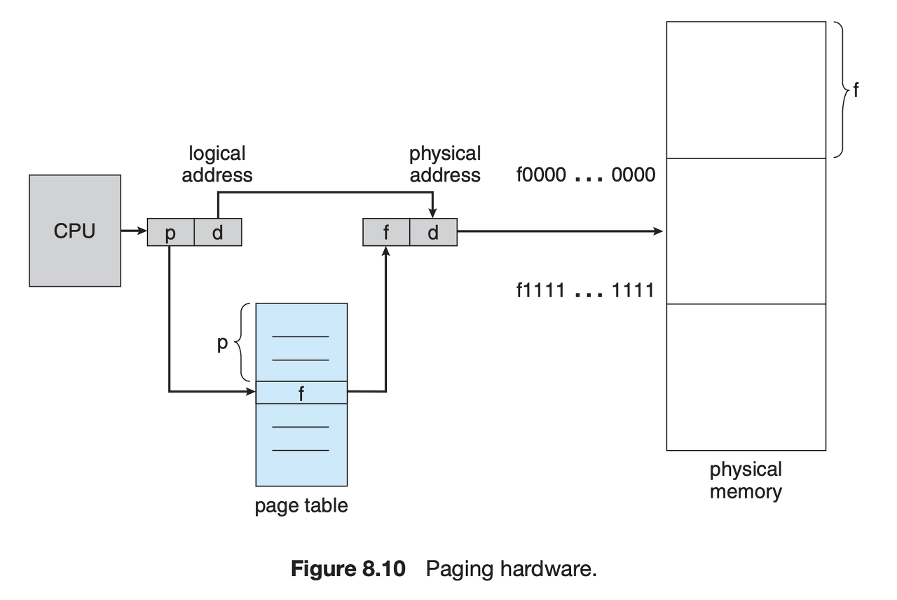 - 페이지 번호 p는 페이지 테이블 접근 시에 인덱스로써 사용되고, 해당 인덱스의 항목에는 그 페이지의 물리적 메모리 상 기준 주소(base address), 즉 시작 위치 f가 저장된다.