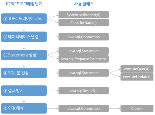 - DBMS 종류(MySQL, MS-SQL, Oracle 등)에 관계 없이 하나의 JDBC API를 사용하여 DB 작업을 처리할 수 있게 된다.