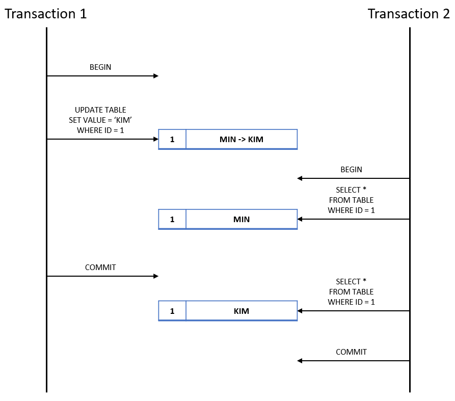 트랜잭션 시작 전에 커밋된 내용에 한해서만 조회된다. MySQL에서는 트랜잭션마다 트랜잭션 ID를 부여하여 트랜잭션 ID보다 작은 트랜잭션 번호에서 변경된 것만 읽게 된다.
