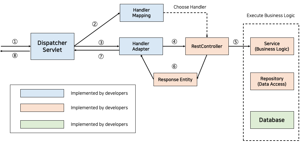 따라서 HandlerMapping은 요청이 오면 Http Method, URI 등을 사용해 Key 객체인 요청 정보를 만들고 Value인 요청을 처리할 HandlerMethod를 찾아 HandlerMethodExecutionChain으로 감싸서 반환한다. HandlerMethodExecutionChain으로 감싸는 이유는 컨트롤러로 요청을 넘겨주기 전에 처리해야 하는 인터셉터 등을 포함하기 위해서이다.