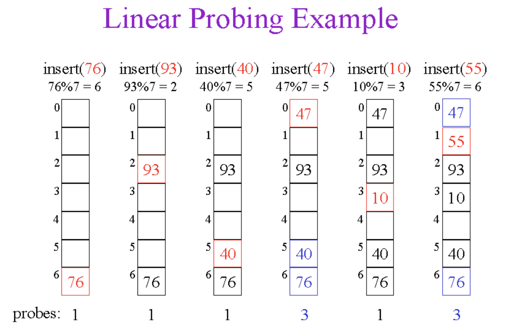 - 단점 : 바로 인접한 인덱스에 데이터를 삽입하기 때문에, 데이터가 밀집되는 클러스터링(Clustering) 현상이 발생 가능 → 탐색 시간이 클러스터링의 크기만큼 길어지게 된다.