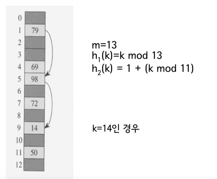 - → 두번째 해시 함수: 해시 충돌이 났을 경우, 탐사 폭을 구함