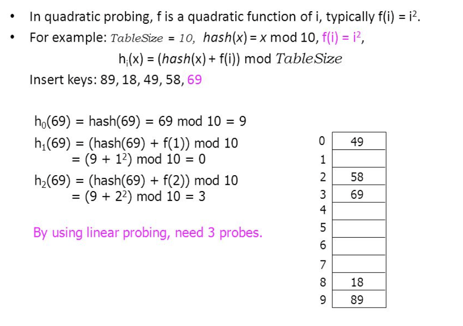 - 배열을 하나씩 이동하며 인접한 빈 공간부터 탐색하는 선형 탐사 방식과 달리, 1^2, 2^2, 3^2, 4^2 의 순으로 배열을 건너 뛰며 빈공간을 탐색하는 방식