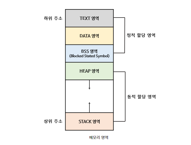 (상위 그림에서는 표현되어있지 않지만,) 초기화 된 데이터는 Data 영역에 저장되고,초기화 되지 않은 데이터는 BSS(Block Stated Symbol)영역에 저장된다.