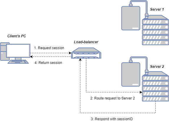 - 클라이언트가 로드밸런서를 거쳐 1번 서버에서 session Id를 발급받았다.