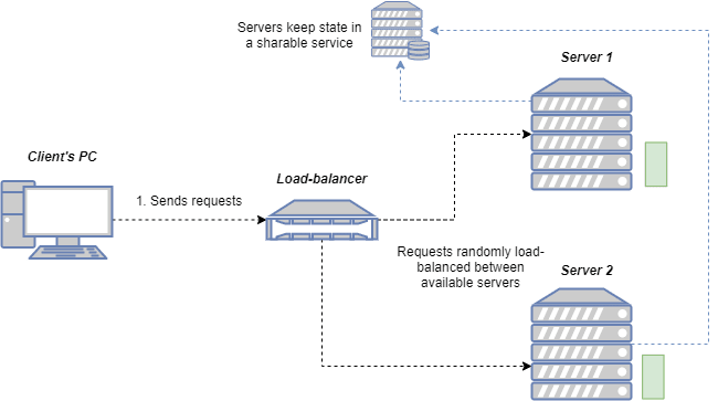 - 애플리케이션이 쉽게 다운될 수 있다. 만일 서버 중 하나가 고장났다면 HDD와 같은 영구 저장소를 사용하더라도 다른 서버에서 이 데이터로 액세스가 불가능하고, 애플리케이션 메모리를 상태 저장소로 사용하게 되면 서버 재시작 시에 이 서버의 세션이 바인딩 된 모든 데이터가 손실된다.