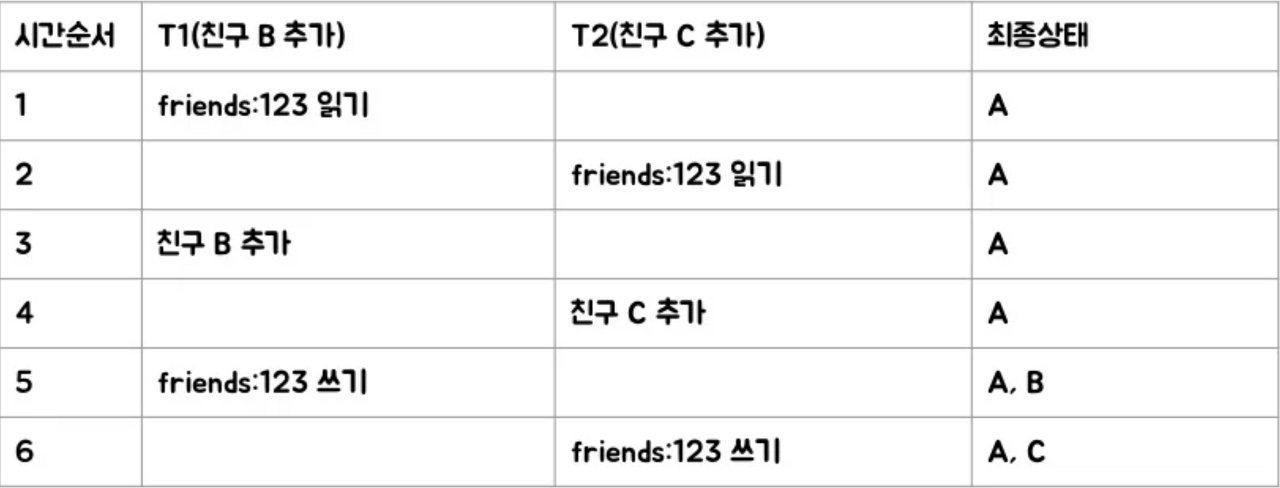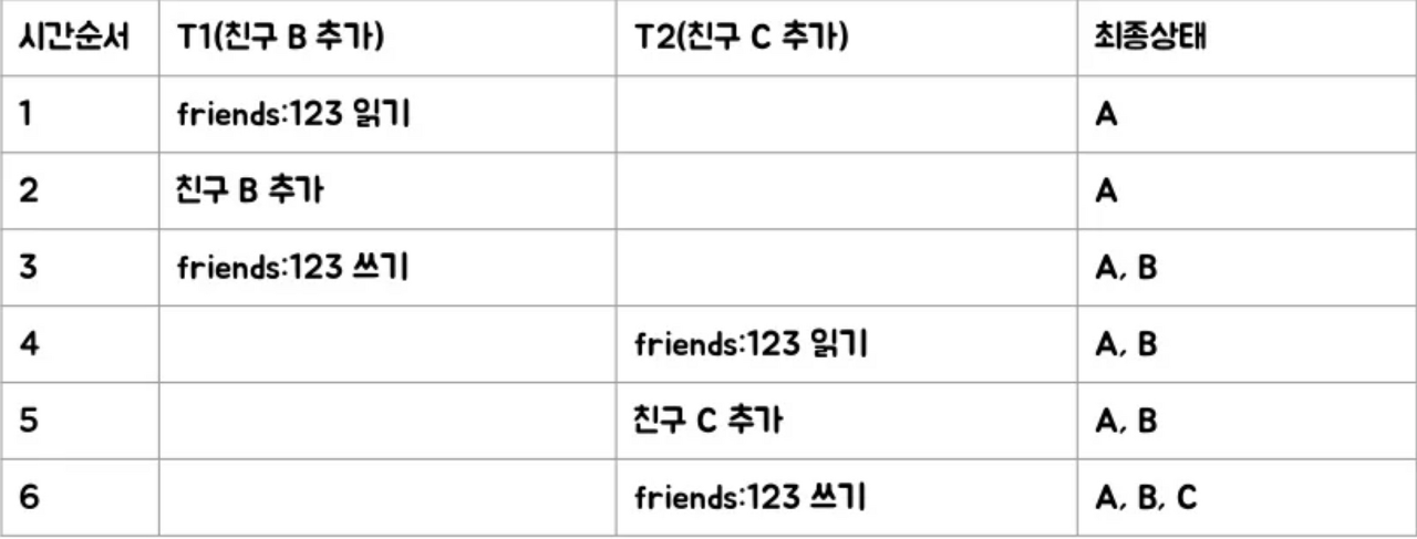 예를 들어, 친구 리스트의 친구를 추가하는 연산을 시도해 보자. 아래와 같이 정상적인 상황에서는 유저 각각의 트랜잭션이 순서대로 잘 행해지고 있으므로 문제가 없다.