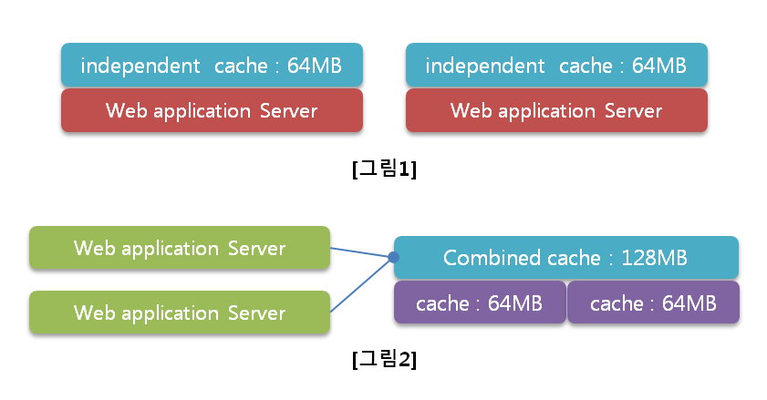 초창기의 캐시 시스템은 [그림 1]과 같이 각 노드가 완전히 독립적으로 운영되어 데이터를 조회하거나 저장 시 어느 서버를 이용할지 관리해야 하고, 용량의 제한으로 인해 비생산적이며 자원 낭비적인 시스템으로 구성되었다.