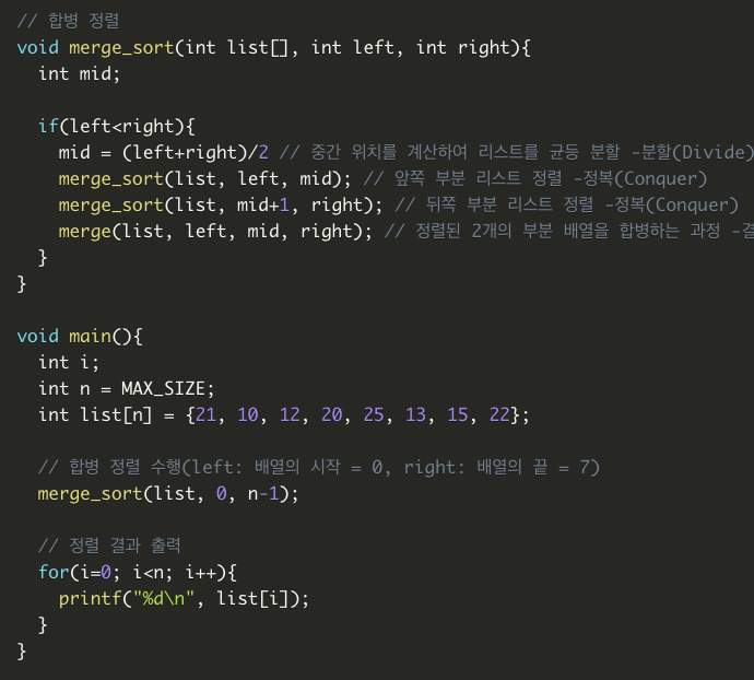 - 합병 정렬에서 실제로 정렬이 이루어지는 시점은 2개의 리스트를 합병(merge)하는 단계