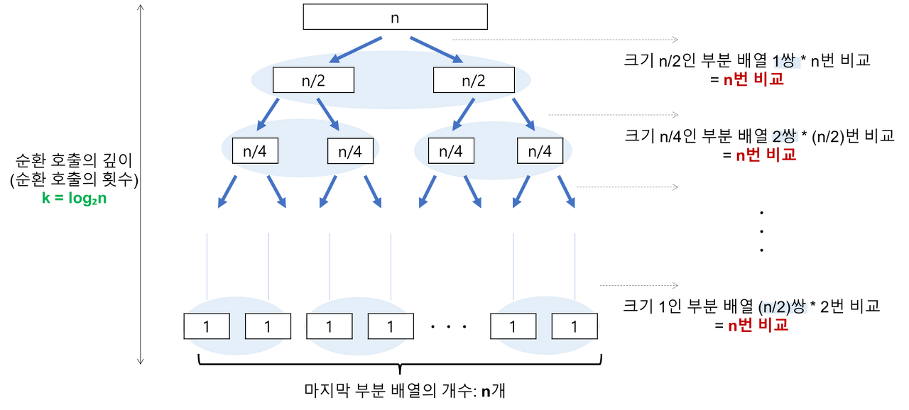 - 각 부분 배열을 정렬할 때도 합병 정렬을 순환적으로 호출하여 적용