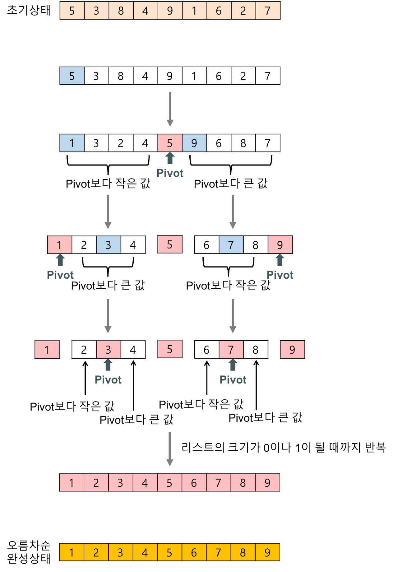 - 퀵 정렬은 다음의 단계들로 이뤄짐