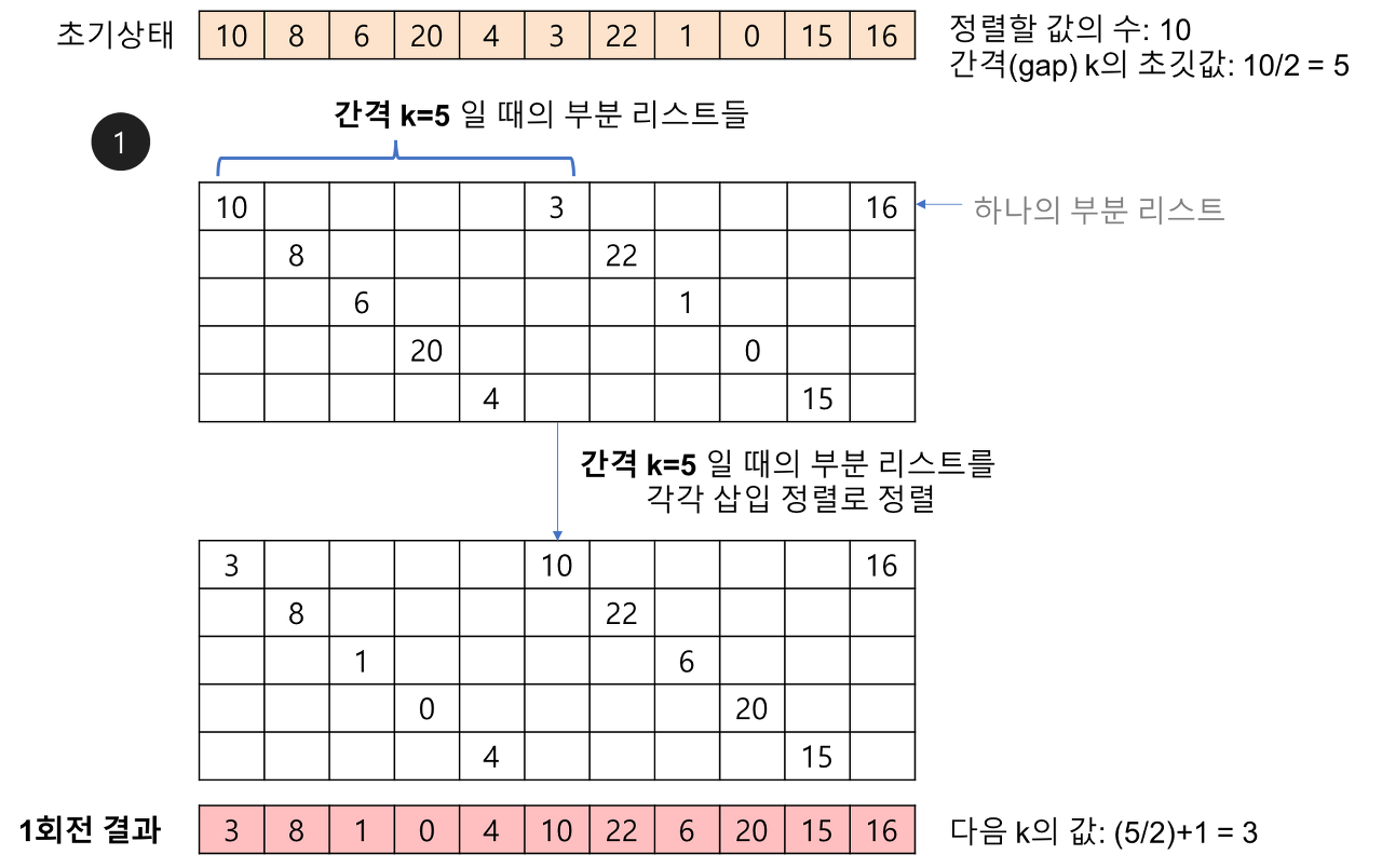 - 정렬해야 할 리스트의 각 k번째 요소를 추출해서 부분 리스트를 만든다. 이때 k를 '간격(gap)'이라 함