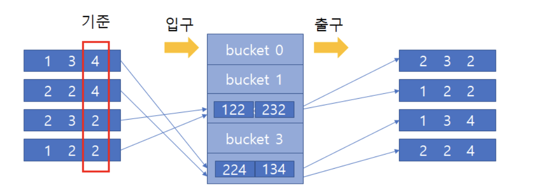 - 버킷이라는 별도의 저장 공간에 정렬을 수행하는 중간 단계를 저장하며 진행